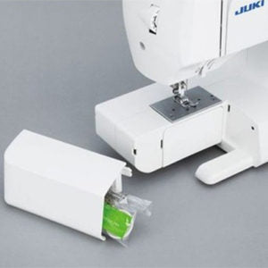 The extension table slides off for free arm sewing. Standard accessory parts can be neatly stored in the box.