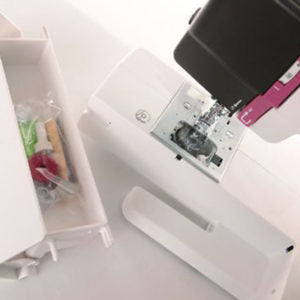 The accessory box slides off for free arm sewing. Standard accessory parts can be neatly stored in the box.