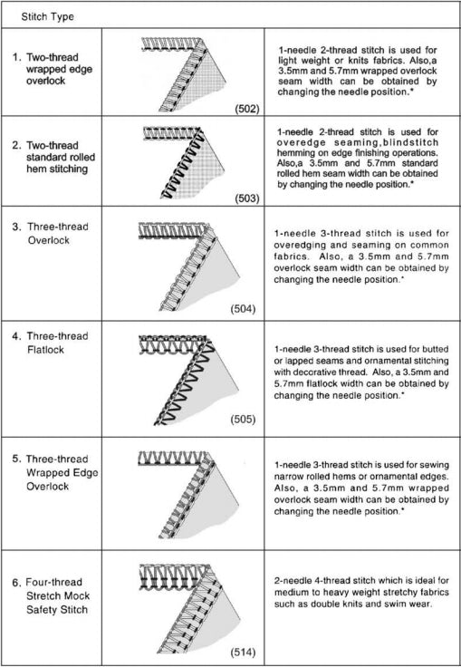 The 6 different stitch types ensure the perfect stitch, regardless of the project: Blind Hems, Rolled Hems, Flatlocking, finishing raw edges and sewing seams.