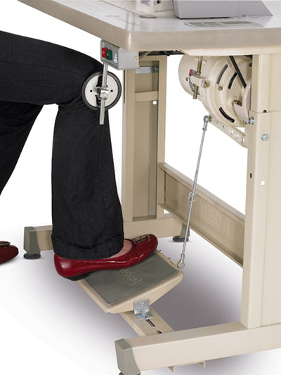 The knee lifter allows for hands-free raising and lowering of the presser foot and is vital for sewing multiple layers of thick fabric. The extra-high knee lifter provides 9.0 mm (0.35 inch) of lift, allowing for more layers of fabric to be sewn than on conventional sewing machines. If the knee lifter is not used, the traditional presser foot lifter allows for 6.35 mm (0.25 inch) of lift. The knee lifter can also be adjusted to operate stitch width. While in use, the knee lifter can be moved from left to right to taper the stitch as desired. This is helpful when appliquing and freehand embroidering. The stitch width can also be adjusted using a lever on the front of the machine.